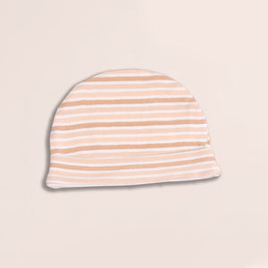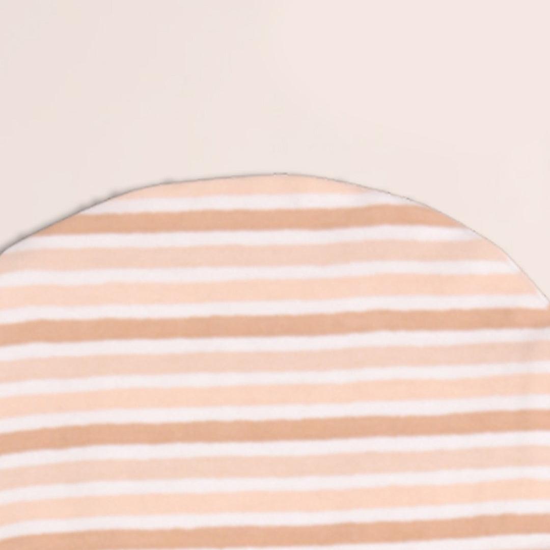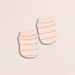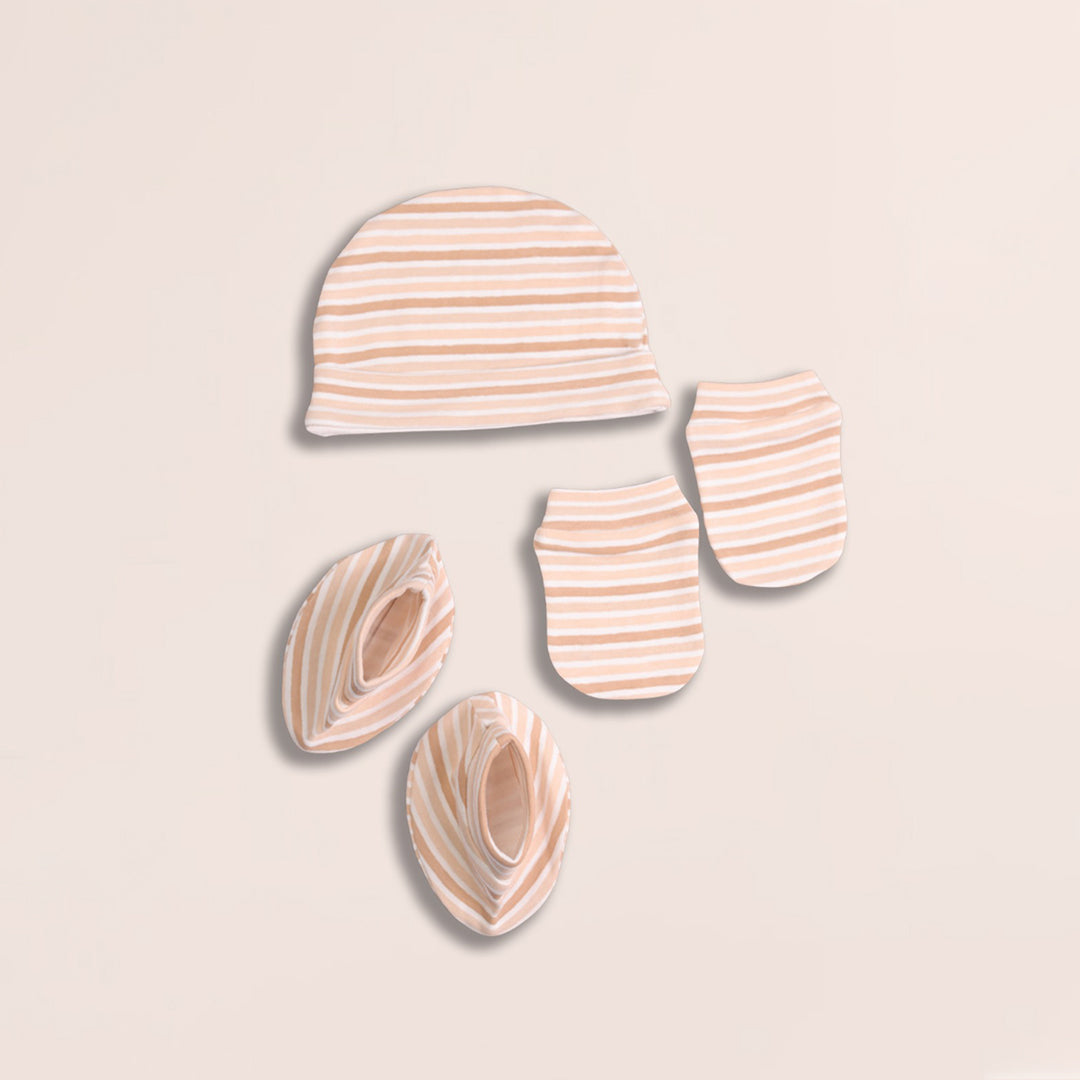 This set has a soft cap, warm mittens, and cozy booties. It is for Preemie, New Born, and 0–3M babies. The pieces come in soft peach stripes that look clean and sweet. The cap sits easy on the head. The mittens keep small hands warm. The booties stay snug on tiny feet. The cotton feels smooth on the skin. The seams are soft and do not hurt. The light stretch helps the baby stay comfy.