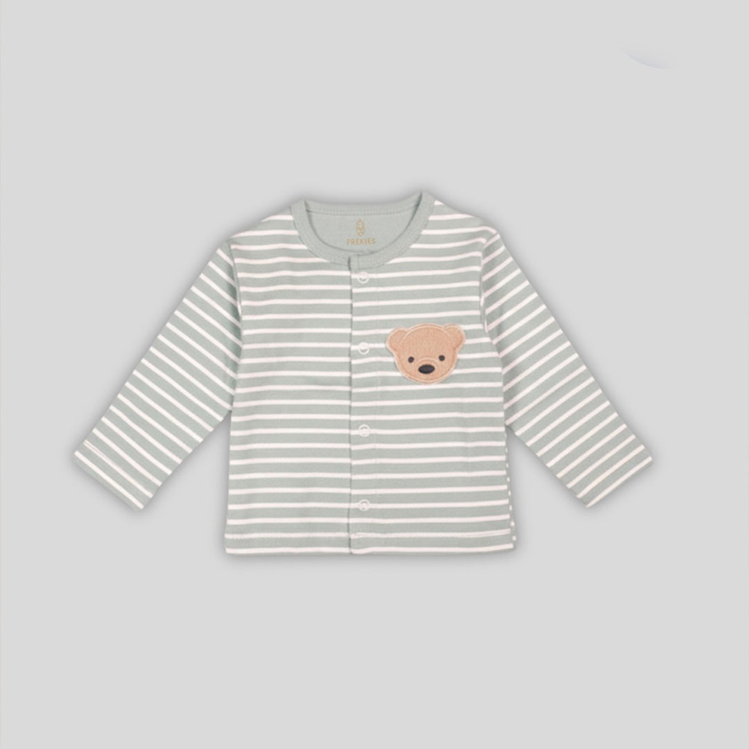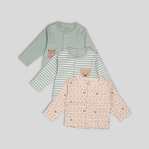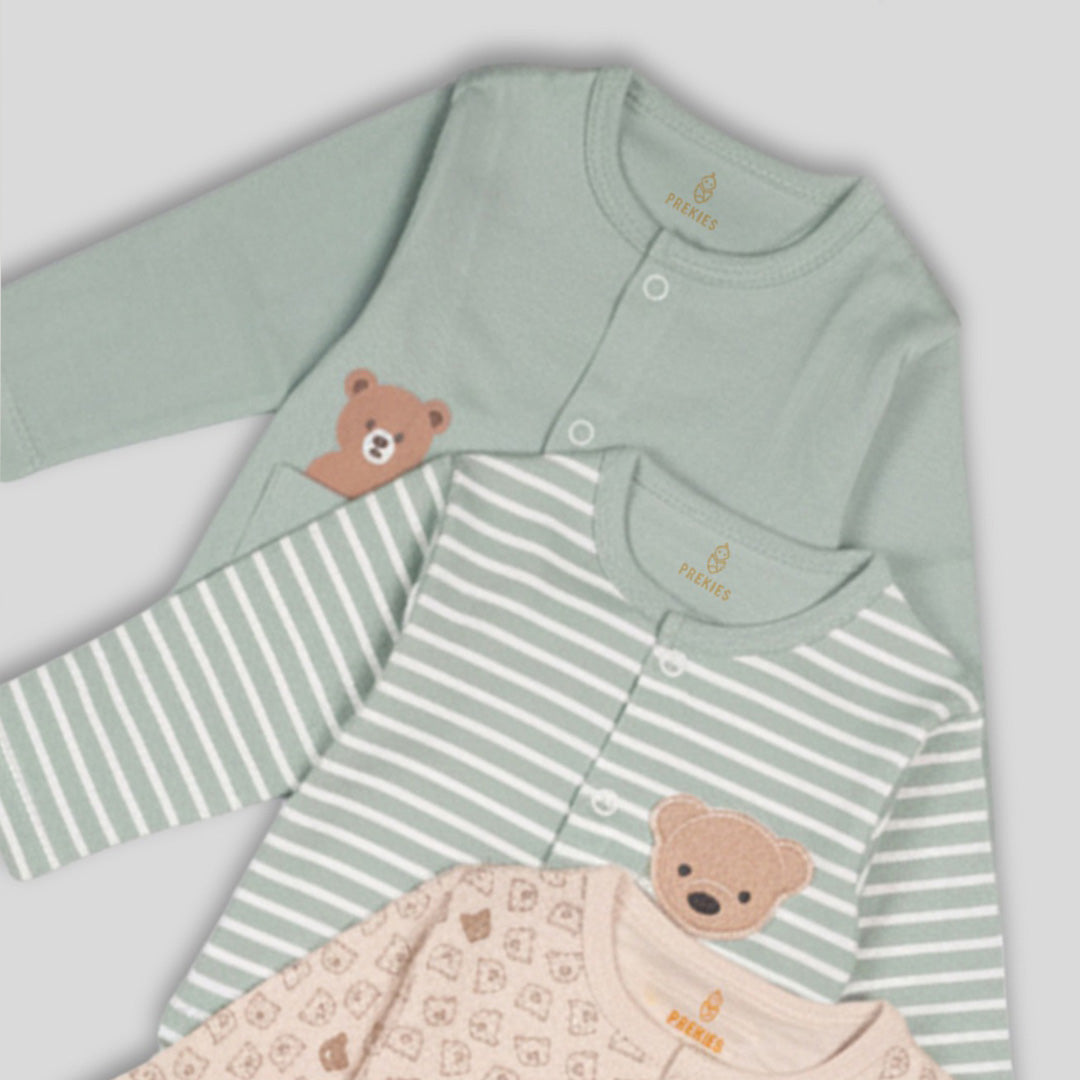 This set has three soft jhablas made for Preemie, Newborn, 0–1 M, and 0–3 M babies. The jhablas come in calm colours with cute bear prints. One has tiny bears all over. One has soft stripes with a bear on the front. One is plain with a neat little bear near the pocket. The buttons open fast, so dressing stays easy. The cloth feels smooth, and the flat seams sit soft on the baby’s skin. The stretch helps the baby move freely.