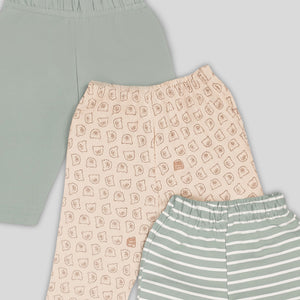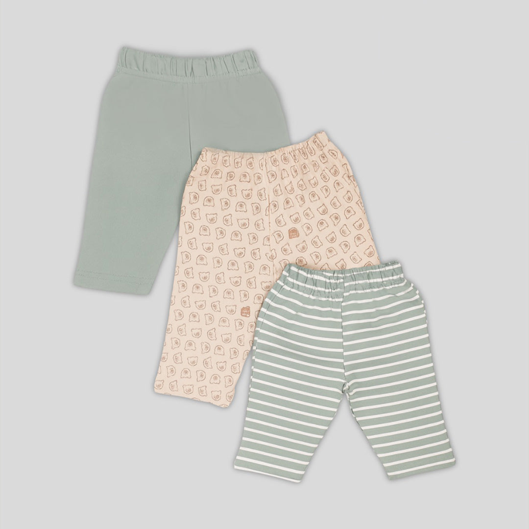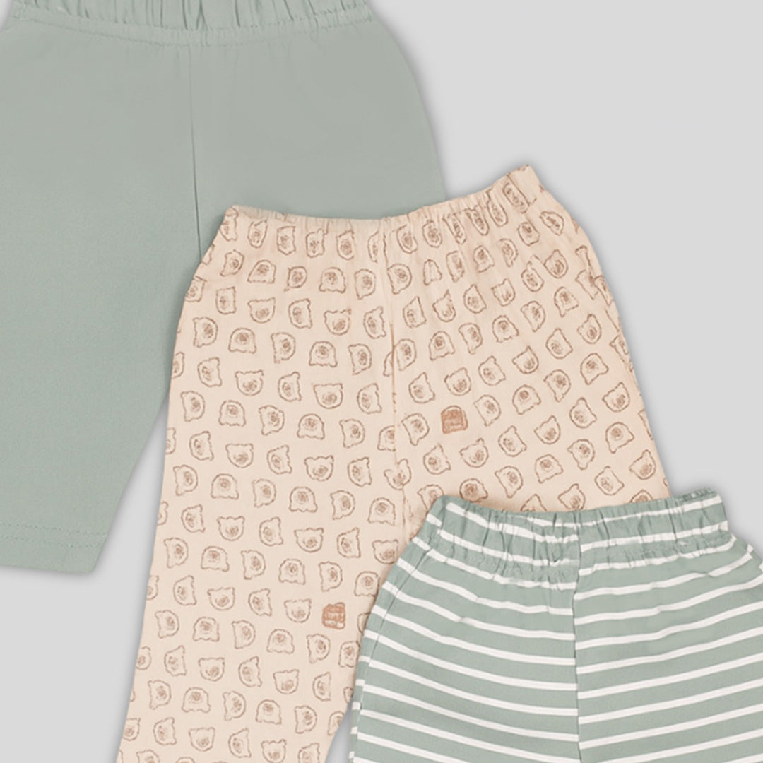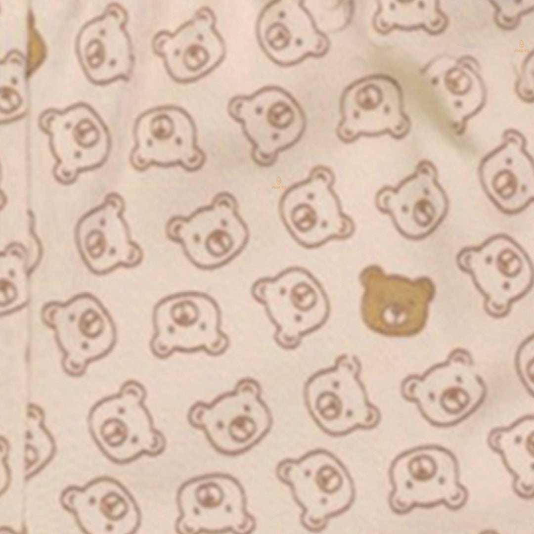 This set has three soft pyjamas made for Preemie, Newborn, 0–1 M, and 0–3 M babies. The pyjamas come in calm shades with a sweet bear theme. One piece has tiny bear faces printed all over. One carries soft, neat stripes. One stays plain for simple everyday use. The elastic waist sits light and does not press the tummy. The fabric lets the legs move freely, bend easily, and stay relaxed. The seams lie flat and feel gentle on newborn skin.